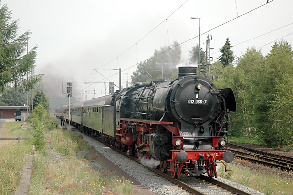 Aschendorf, 18 juni 2006. Loc 012 066 (voorheen 01 1066) komt met 120 km/uur voorbij, op weg van Emden naar Rheine. Foto Wim Hoekema. |