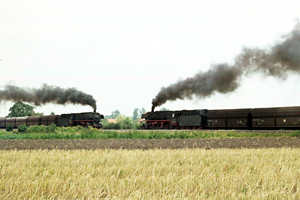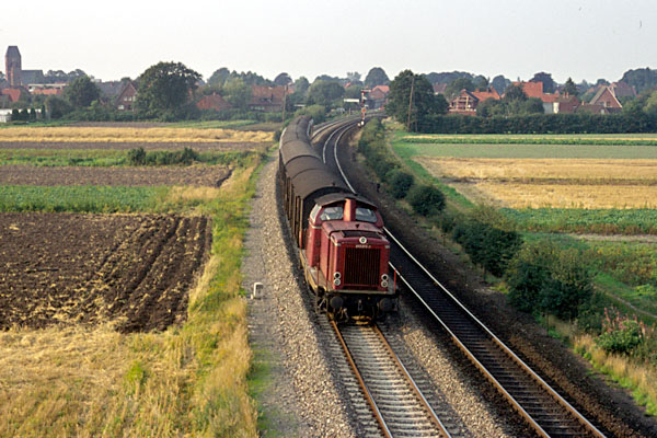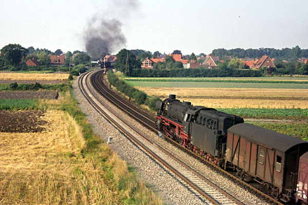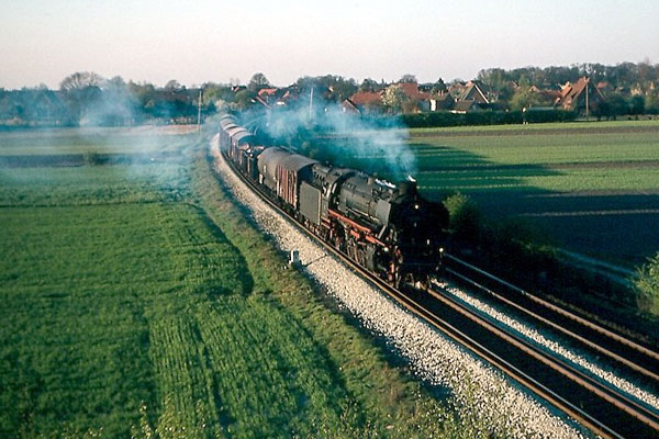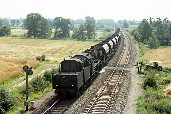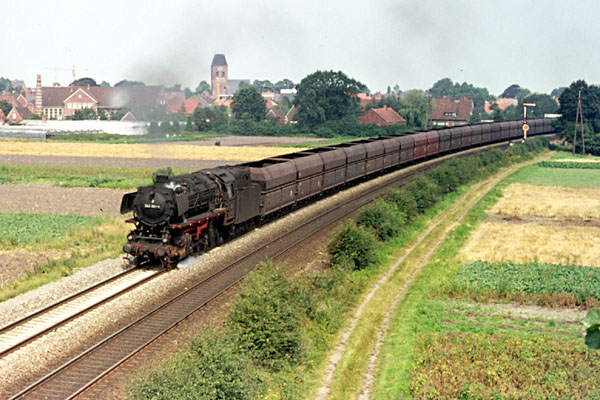 Aschendorf, 21 augustus 1974. Loc 052 529 met een lege kolentrein richting Rheine. Kolen werden vervoerd in open bakken (type E), terwijl ijzererts werd vervoerd in zelflossers (type F). Naar de haven van Emden waren de kolentreinen vol, in omgekeerde richting de ertstreinen. |