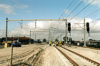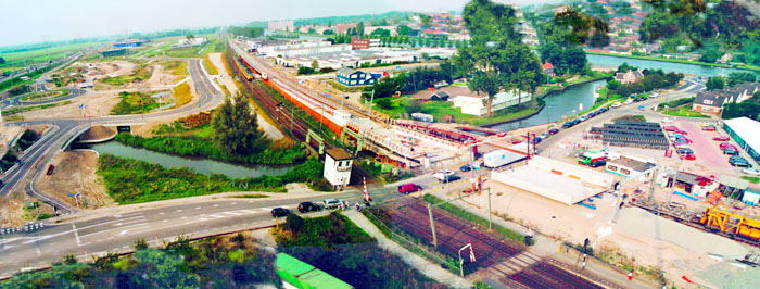 De spoorverdubbeling tussen Utrecht en Amsterdam Bijlmer waar de spoorlijn splitst in een richting via de Utrechtboog naar de Zuidtak en verder naar Schiphol en een richting naar Duivendrecht/Amsterdam CS, nadert zijn voltooiing. De Utrechtboog komt in maart 2006 (met vertraging van enkele maanden, zie Het Openbaar Vervoer/Railnieuws, nr. 563; november 2005, pagina 320) in dienst, waarna het zuiden van Nederland via Utrecht een rechtstreekse spoorverbinding krijgt met de luchthaven Schiphol. Het spoortraject tussen Amsterdam en Utrecht, in vakjargon ook wel de “Utrechtse lijn” genoemd (zie ook het thema Procesleiding op het spoor) is een belangrijke noord-zuid corridor in de vervoerstromen tussen noord- en zuid-Nederland. Zowel het wegverkeer op de vrijwel parallel lopende de autosnelweg A2, het treinverkeer en het scheepvaartverkeer op het Amsterdam-Rijnkanaal zijn de laatste jaren explosief gestegen in intensiteit en verkeersvolume. In Breukelen liggen deze drie vervoerssystemen hemelsbreed op een paar honderd meter nauw tegen elkaar aan (zie kaartje hiernaast). Een bijzonder knelpunt, omdat in Breukelen ook nog eens de aftakking van de spoorlijn naar Gouda via Harmelen en Woerden gelijkvloers plaats vond en met een onderdoorgang onder de A2 doorloopt. Via deze aftakking rijdt de treinserie 4000 (Amsterdam–Rotterdam) en vrijwel al het goederenverkeer van/naar de Kijfhoek, dat via de Utrechtse lijn en Zuidtak en Gooilijn Amersfoort en verder kan bereiken (zonder kopmaken dan wanneer de route via Utrecht/Lunetten zou lopen). Het traject Amsterdam–Breukelen–Woerden–Gouda en verder geldt ook nog eens als omleidingsroute voor de internationale treinen naar Brussel (Benelux) en Parijs (Thalys) wanneer de standaardroutes gestremd zijn. Van twee naar vier sporenWat ook wel de viersporigheid Amsterdam-Utrecht wordt genoemd, komt voort uit de Meerjarennota Infrastructuur van de overheid waarin kapitaalinvesteringen zijn voorzien om grote infrastructurele knelpunten in met name de Randstad van Nederland op te lossen. De werkzaamheden vingen op diverse locaties gelijktijdig aan in 2001. Het uitrijden van zandpakketten ten behoeve van de nieuwe aarden baan en het functievrij maken van gronden en terreinen die tot dan toe anders in gebruik waren. Met name ondergrondse bekabeling en verlegging van leidingen nam in de eerste fase veel tijd in beslag. Het project is daartoe in verschillende Directievoeringen ondergebracht. Zowel Holland Rail Consult als Arcadis voeren elk hun eigen spoordeel uit. Inmiddels zijn compleet vernieuwde stations verrezen in Maarssen, Breukelen, Abcoude en Bijlmer. De aanpassing van het station Breukelen valt onder de directie van Holland Rail Consult. Grote ombouwIn het lange weekend van donderdag 12 september tot en met zondag 15 september 2002 vonden zeer omvangrijke werkzaamheden plaats die het aanzien van de sporensituatie ter plaatse voorgoed drastisch zouden veranderen. Als belangrijkste noemen we: