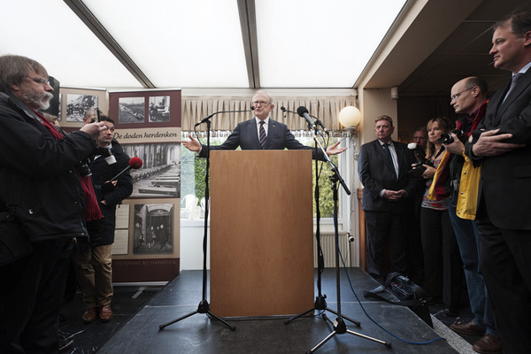 Onthulling van het monument bij Harmelen door Pieter van Vollenhoven op 8 januari 2012. De andere spreker is Ed Janson van het comité dat heeft geijverd voor dit monument ter nagedachtenis aan de slachtoffers van de treinramp op 8 januari 1962. Tussen de genodigden zien we onder anderen de burgemeester van Woerden, de commissaris van de koningin van Noord-Holland en de directeuren van NS en ProRail. |