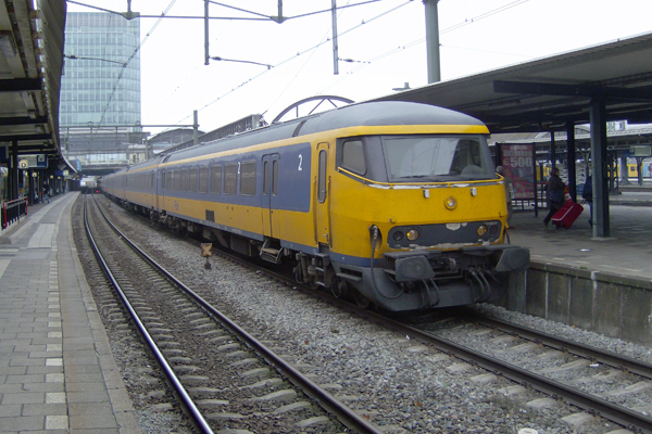 Amsterdam Amstel, 28 januari 2003. Loc 1837 met een Intercity uit Utrecht. Dit is de vroegere 1637, nog steeds in de rode kleur die ze in haar diensttijd bij NS Cargo heeft gekregen, maar een maand later zou de loc weer geel zijn. Een metrostel probeert de trein in te halen. |