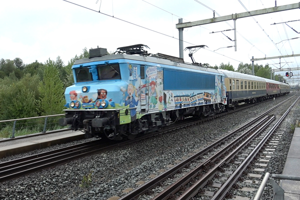 Helmond, 13 november 2005. Een Amerikaans orkest, de New York Symphony, gebruikte de trein om zich te verplaatsen. Op vrijdag 11 november reed de trein van België naar Amsterdam. Op zondag 13 november ging de reis via Hilversum en Arnhem naar Duitsland, en weer terug via Venlo en Eindhoven naar België. De trein bestond uit drie Belgische rijtuigen, hier getrokken door loc 1858. Foto Arnold de Vries. |