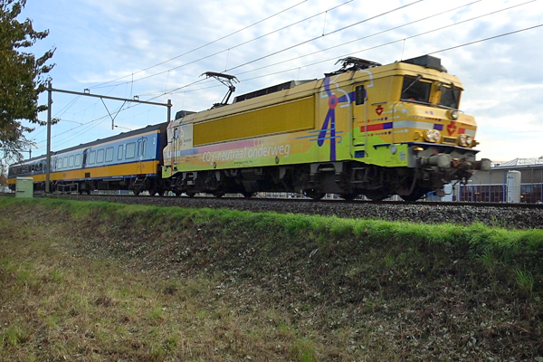 Zutphen, 23 september 2019. Bij de werkplaats staat de vroegere loc 1824 (ooit 1624 "Alkmaar"). De loc is overgenomen door Strukton, die haar heeft omgebouwd tot hybride loc: ze kan zowel via de bovenleiding als op accu's rijden. Op 13 september 2019 is ze officieel in gebruik genomen; daarbij kreeg ze de naam "Nicole". Over de kleurstelling kunnen de meningen verschillen. Foto Simon Geltink. Nicole is niet de eerste hybride loc. Begin 2014 werd loc 1823 in opdracht van HUSA door Shunter voorzien van een dieselmotor, om in Blerick zonder bovenleiding te kunnen rangeren. De tractiemotoren bleken echter niet goed te werken, zodat het experiment is stopgezet. |
