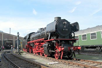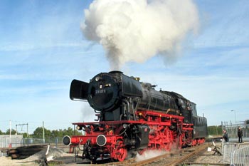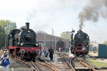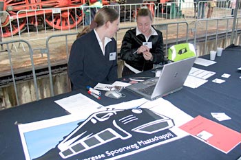 Rotterdam, 12 oktober 2003. De vuurloze loc van de SSN was ook onder stoom. In de loods waren diverse stands, waaronder die van de Nostalgie Expresse Spoorweg Maatschappij. |