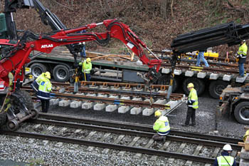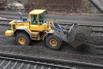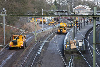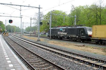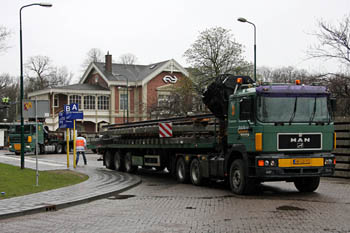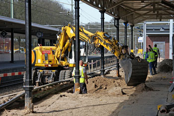 Werkzaamheden spoor 802Naast het weer in gebruik stellen van spoor 801, werd er ook gewerkt aan de vernieuwing van spoor 802. Deze werkzaamheden vonden plaats tijdens een buitendienststelling op 3 en 4 april. Spoor 802 was het laatste spoor op het Baarnse emplacement dat nog bestond uit houten biels. Het werd nu tijd om deze te vervangen door zware betonnen exemplaren. Waarschijnlijk als gevolg van de geringe ruimte en -spoorcapaciteit op het emplacement Baarn kon de gebruikelijke wijze van aan- en afvoer van ballast - namelijk per trein - niet worden toegepast. Alle benodigde materialen werden over de weg door vrachtwagens aangevoerd, ook alle ballast. Daar zorgde een groot aantal vijfassige kippers voor. Achter het inmiddels gesloopte oude gedeelte van perron 1 dumpten de trucks hun lading, waarna deze vervolgens achteruit reden langs spoor 801 in de richting van de voetgangersbrug om via een shovel de retourlading in ontvangst te nemen; de oude ballast van spoor 802. Vanaf de brug hadden geïnteresseerde toeschouwers een dynamisch en fascinerend overzicht op de georganiseerde chaos onder hen. Terwijl in noordelijke richting via het smalle pad langs spoor 801, de wissels 14A en 14B in grote hapklare brokken en in de juiste volgorde van montage op trailers werden aangevoerd, waren in zuidelijke richting een bulldozer, diverse shovels en knikdumpers bezig het ballastbed van spoor 802 te vervangen. |