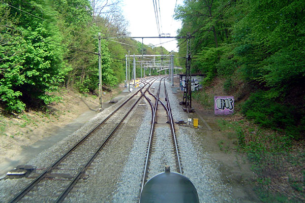 Baarn, 5 mei 2010. Een trein uit Hilversum nadert de overloopwissels. Het eerste paar is 9A/9B, het tweede (nieuwe) paar is 14A/14B. Foto vanuit een Koploper genomen door Bas van Heezik. |