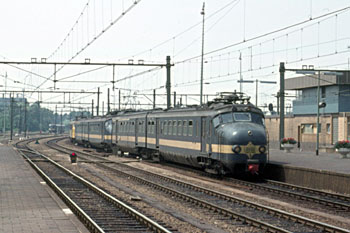 Rotterdam CS, 14 juli 1973. NMBS-loc 5166 met TEE 82 "Etoile du Nord" naar Parijs. De trein bestaat uit roestvrijstalen (Inox) rijtuigen, waaronder een rijtuig voor de energievoorziening van de trein. Deze treinen werden ook wel met Belgische meerspanningslocs gereden. Voor foto's van de tegentrein, TEE 81 "Ile de France", zie verderop. |