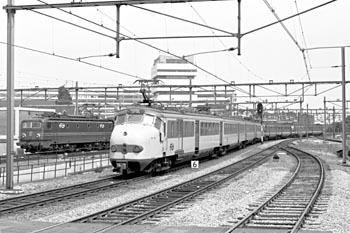 Rotterdam CS, 14 juli 1973. TEE-treinstel 1002 op weg naar Zwitserland. Treinstel 1697 als stoptrein naar Hoek van Holland. |