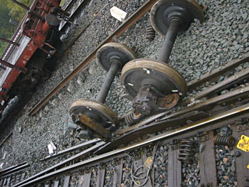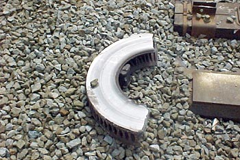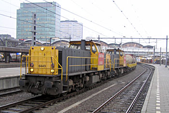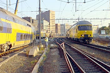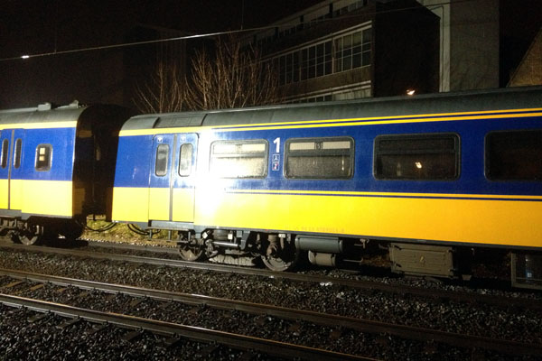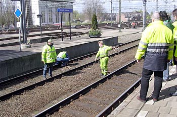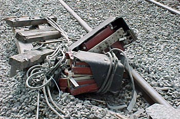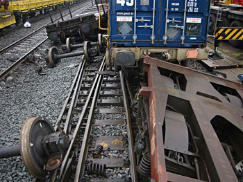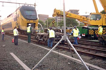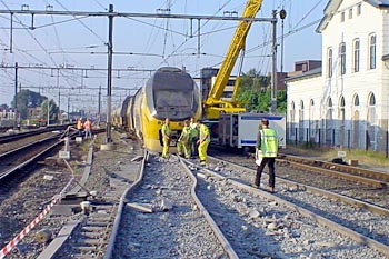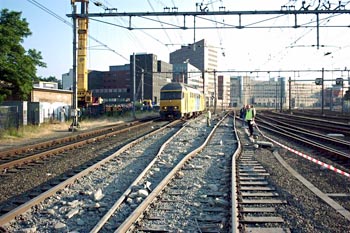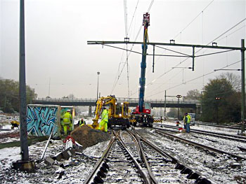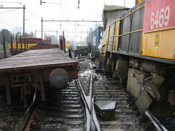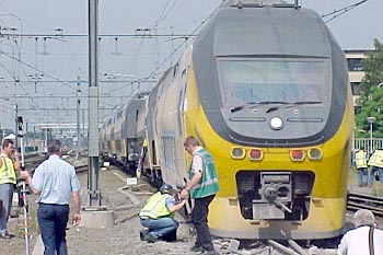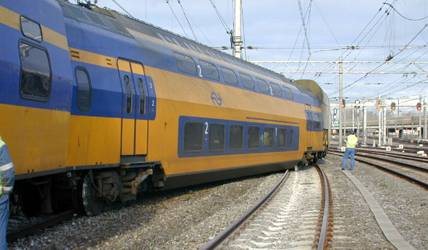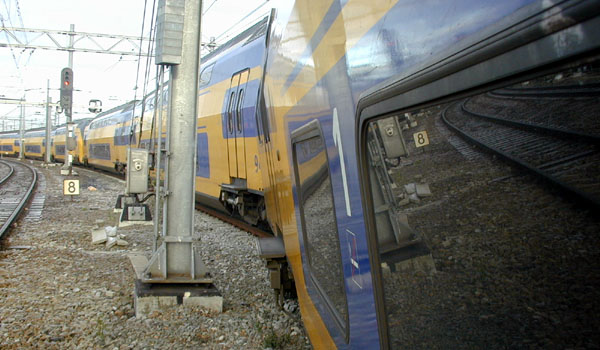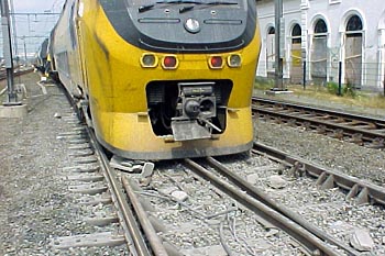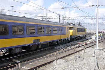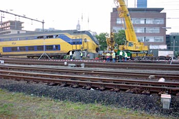Utrecht Centraal, 23 januari 2007. Hier is duidelijk iets misgegaan in het subtiele samenspel tussen wissel en trein. Een urenlange stremming was het gevolg. De trein kwam van een opstelterrein, er zaten dus geen passagiers in. Als mogelijke oorzaak wordt genoemd dat de rangeermachinist door een rood sein is gereden, waarna hij van de treindienstleiding opdracht kreeg om weer terug te rijden. De trein had na het passeren van het rode sein echter een paar wissels opengereden, en dan is achteruit terugrijden een minder goed idee. Foto's Stefan Doek. |