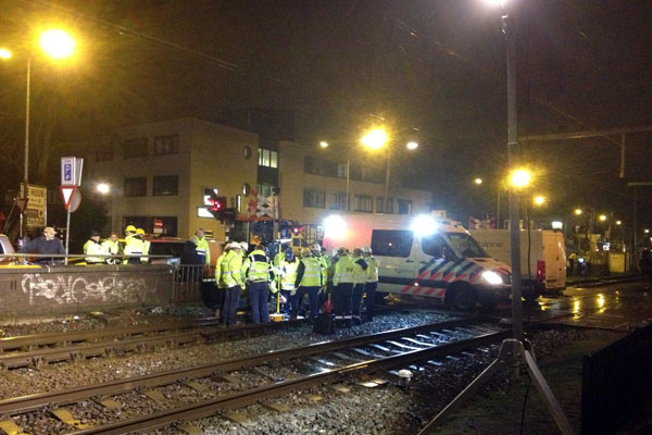 Hilversum, 15 januari 2014. Bij de kleine spoorbomen is een treinstel ontspoord. Gelukkig rijden de treinen hier niet snel en gelukkig was het geen chloortrein, maar mijn zus zat er maar mooi mee. Een hoop herrie, vooral van de spoorbomen die maar bleven doorrinkelen. De ontsporing vond plaats in haar achtertuin, als ze een achtertuin gehad had. Foto's Carina Spilt. |