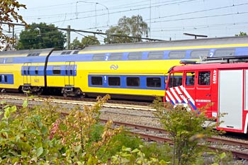 Ede-Wageningen, 10 september 2004. Dick Donkervoort stuurde deze foto's. Er was brand ontstaan in een van de bakken van treinstam 9401, de eerste verlengde dubbeldekker.