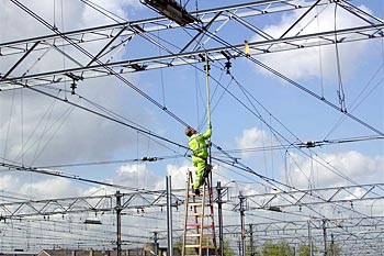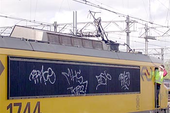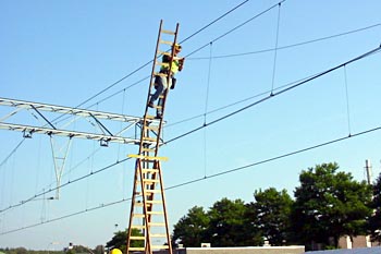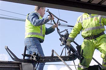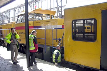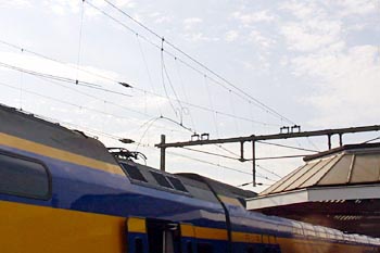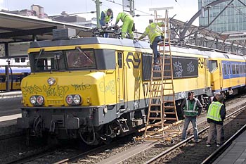 Gijs Cornelisse maakte op 7 april 2005 deze foto's van een locomotief die een stroomafnemer kwijtraakte, tijdens het vertrek uit Utrecht Centraal. De trein werd door een dieselloc weer langs het perron getrokken, waarna monteurs aan de slag gingen om de bovenleiding te herstellen. De loc kon later, met behulp van de andere stroomafnemer, zijn weg weer vervolgen. Dit alles vond plaats kort nadat het treinverkeer rond Utrecht weer op gang was gekomen, na een grote computerstoring die een dag eerder was ontstaan. Ook het reservesysteem van ProRail was uitgevallen. Meer dan een etmaal was het treinverkeer lamgelegd. |