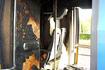 Haarlem, 12 juni 2004. Uitgebrande cabine van een treinstel plan T. Ook de achterliggende coupé's hebben grote schade opgelopen. |