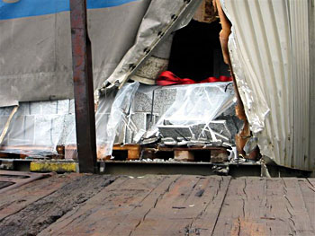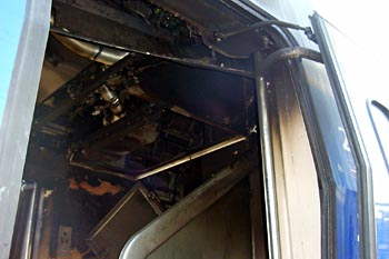 Werkplaats Haarlem, 25 november 2003. Het uitgebrande middenrijtuig van treinstel 4044. Foto's Huub van Meurs. |