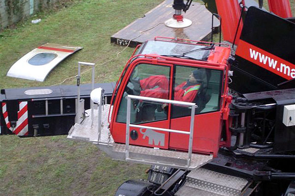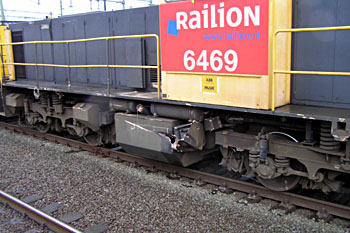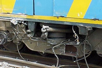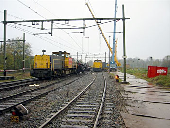 Utrecht, 30 november 2005. Loc 6449 neemt in opzending haar zus 6469 mee, die op 25 november betrokken is geweest bij de aanrijding bij Lunetten. Volgens mij is dat een kapotte dieseltank daar aan de zijkant. Foto's Felix Parmentier. Hieronder nog een aantal foto's van de opruimingswerkzaamheden, mij toegestuurd door John Hogaarts. |