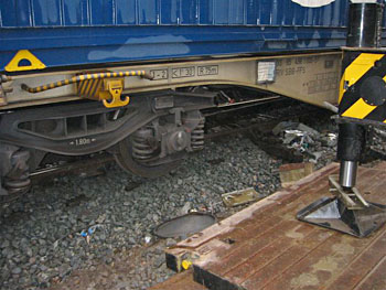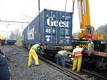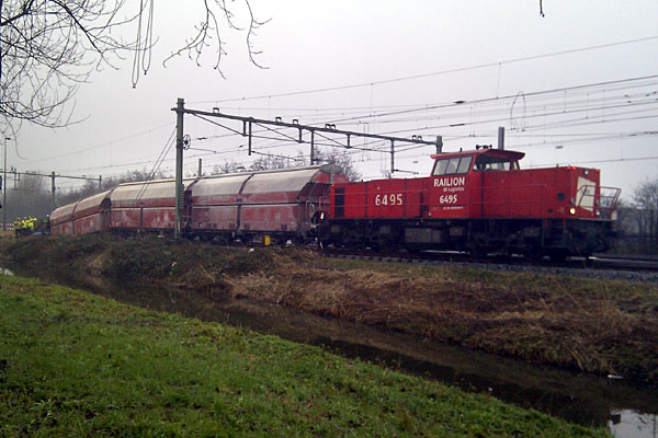 Beverwijk, 12 februari 2011. Loc 6495 met drie kalkwagens. Tijdens het omlopen van een locomotief ging er iets mis: men was vergeten de wagens op de rem te zetten en aan het einde van het onlangs gewijzigde spoor zat nog geen stootjuk. De gele mannetjes wachten op hulp van een kraan. De rest van de trein was toen al weggehaald. Foto Ger Kwerreveld. |