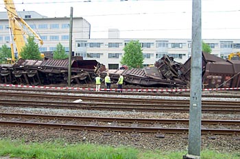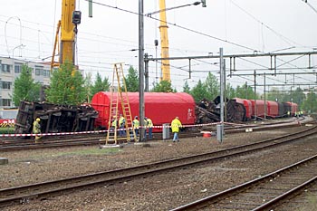 Apeldoorn, 30 april 2003. Hugo Stolp en Pascal Esselink maakten deze foto's van een ontspoorde staaltrein. De machinist van loc 1615 was een beetje te snel door een wissel gereden. |
