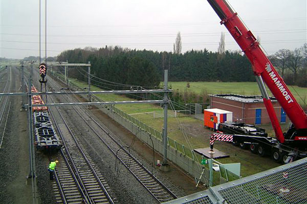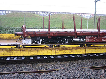 Amersfoort, 3 augustus 2005. Een kuilwagen (type Uaais 779) met een transformator, op weg van Polen naar Amsterdam Westhaven, wist het bij een wissel even niet meer. Het wachten is nu op een andere kuilwagen, waarna de transformator zijn weg kan vervolgen. Foto Bertus Kers. |