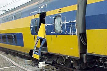 Maastricht, 7 juli 2006. Bij het koppelen van twee treinstellen ging het even mis. In een van de treinstellen bevonden zich passagiers, waarvan er diverse gewond raakten. Blijven zitten totdat de trein stil staat, zeg ik altijd maar. Bas Gerritsen maakte deze foto's van een gebutst en ontwricht treinstel 871. |