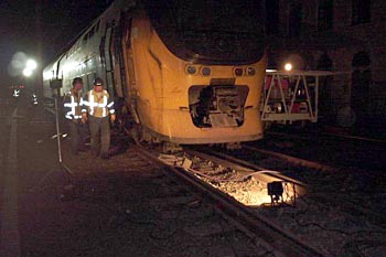 Maastricht, 29 december 2007. Deze trein kon niet op tijd stoppen als gevolg van gladde rails, veroorzaakt door zeepresten en uitwerpselen. Dit spoor wordt namelijk gebruikt voor het reinigen van treinstellen. Een dag eerder kon een andere machinist nog net voor het stootblok tot stilstand komen. Met zijn waarschuwing dat de rails glad waren is verder niets gedaan. Ook van andere kopstations (Leeuwarden, Groningen) zijn dit soort incidenten bekend. Enkele reizigers raakten gewond. Dat zullen mensen zijn geweest die niet even zijn blijven zitten totdat de trein helemaal stilstond. De foto is kort na het ongeval gemaakt door Eric Pieters. |