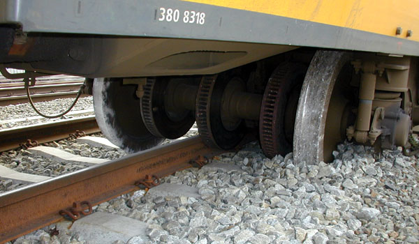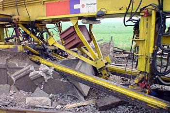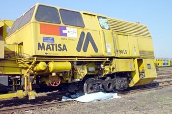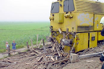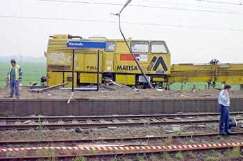Abcoude, 2 augustus 2002. Johann van Dijk (hoofdmonteur Strukton Railinfra) maakte deze foto's van de ontspoorde Matisa, een vernieuwingstrein van Strukton. De laatste foto is gemaakt op de Watergraafsmeer.