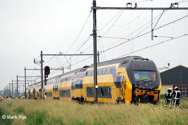 Waarland (tussen Schagen en Heerhugowaard), 5 juni 2008. VIRM 8642 is op een overweg tegen een heftruck gereden. De trein is ontspoord. De machinist en twee reizigers raakten lichtgewond. Foto Mark Rijs. |
