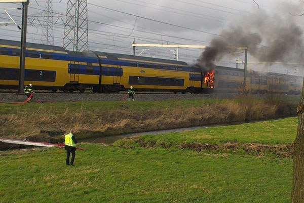 Loenersloot, 2 januari 2013. Brandend treinstel, mogelijk het gevolg van een vuurwerkbom in een toilet. Normaal willen hulpverleners dat passagiers zo lang mogelijk opgesloten blijven in een ongelukstrein, maar dit keer durfde men dat risico niet aan. Een meevaller was ook dat op deze plek toevallig nog geen geluidsschermen staan. Foto Marcel van Westendorp. |