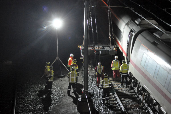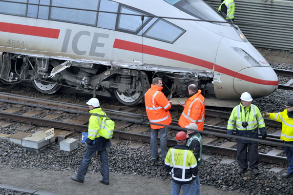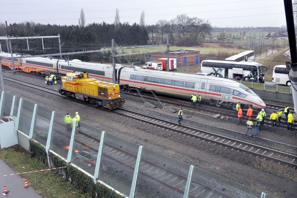 Zevenaar, 12 januari 2011. De beschadigde ICE is op een van de stationssporen gezet. Ondertussen vinden er opruimingswerzaamheden plaats. Foto's Lennart Visser.