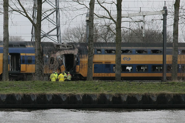 Zwolle, 13 maart 2006. Op de IJselbrug bij Zwolle zijn 's ochtends twee bakken (Bv en mDDM) van een dubbeldekker uitgebrand. Nadat de trein was weggesleept wordt de schade opgenomen. Foto's Hendrik Spek. |