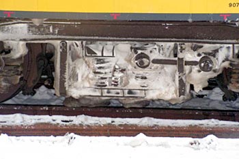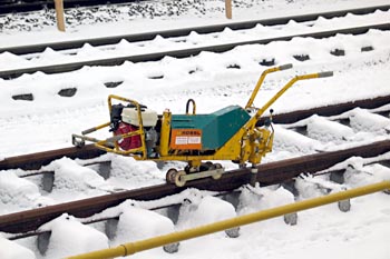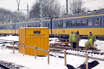 "Obelix" op de Trans-Siberiëspoorlijn ter hoogte van Gaasperdam, 5 maart 2005. De werkzaamheden bestonden uit het lossen van een trein geladen met een diepgevroren HSL-wissel. Foto collectie Jeroen Mooij. |