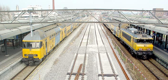 Woerden, 31 maart 2005. Het middenperron is weg. De rails voor de doorgaande sporen liggen klaar. |