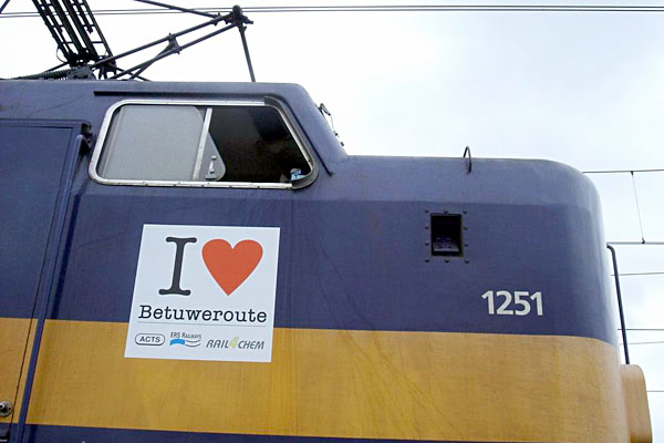 ACTS, ERS Railways en Rail4Chem zien de Betuweroute opeens wel zitten, nu de overheid de tarieven heeft verlaagd. Genoeg reden om alle locs te voorzien van weemakende stickers. (Van die lichtbakken boven de snelweg, met "I love rechtsrijden", krijg ik ontzettend de neiging om te gaan steenhuizen.) Bertus Kers maakte op 30 september 2005 een serie foto's van beplakte ACTS-locs, waarvan ik er hier eentje plaats. |