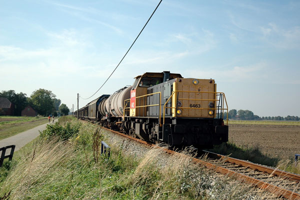 Nieuweschans, 23 september 2005. Loc 6463 met UnitCargo 45767. Dit is de nieuwe grensoverschrijdende goederenslag Onnen-Leer v.v. In de trein een aantal uit Delfzijl afkomstige grootvolumewagens. Foto Wim Hoekema. |