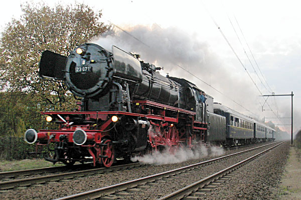 Bilthoven, 29 oktober 2005. Geen gejakker, maar met een statige snelheid. Dan kun je er langs de rails rustig van genieten en hoef je ook niet te stunten met sluitersnelheden. En het is ook beter voor het materieel natuurlijk. VSM-loc 23 071 kwam keurig op tijd, zoals we dat van de VSM gewend zijn, door Bilthoven, om kop te maken in Amersfoort en via Lunetten weer terug te keren naar Dieren. Het betrof een besloten rit naar het Spoorwegmuseum. |
