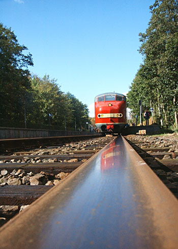 Wurzbach (Thüringen), 25 oktober 2005. Loc MEG 202, een van de BUNA afkomstige V180, die nu door Railion wordt gehuurd van de MEG. (LEW fabrieksnummer 280111). Bij de DR waren dergelijke locs ook in gebruik, eerst als V180, later als Baureihe 118, bij de DB als 228. Foto's Richard Klok. |
