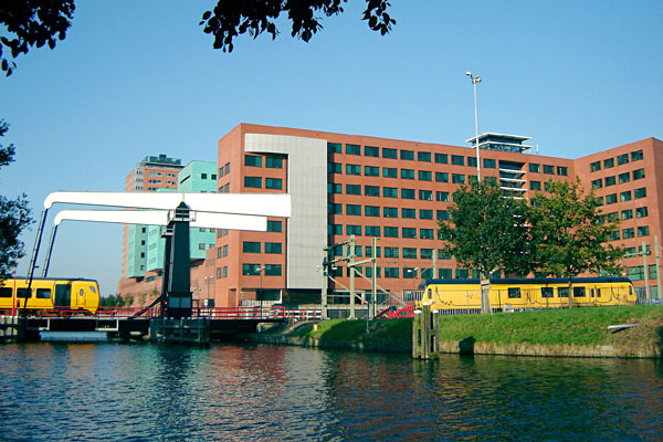 Groningen, 18 oktober 2005. Ultrasoon meetrijtuig UST 96 staat op opstelspoor 40, en is net gepasseerd door twee Buffels die de brug over het Noord Willemskanaal oversteken op weg naar Leeuwarden. Foto Bas Jantzen. |