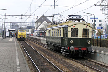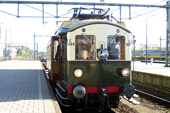 Motorrijtuig C9002 "Jaap" tijdens een rondrit op 31 oktober 2005 gefotografeerd in Eindhoven (door Rob Quaedvlieg) en rijdend door Alphen a/d Rijn (door Felix Parmentier). Het stationsgebouw van Alphen a/d Rijn staat op de slooplijst! |