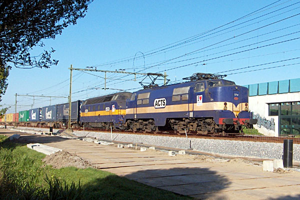Bunnik, 3 oktober 2005. ACTS-locs 1255 en 6703 met een containertrein (Linz-shuttle) op weg van Rotterdam naar Duitsland. Over een paar jaar zullen veel van dit soort treinen via de Betuweroute rijden, tussen hoge geluidschermen door, achter locomotieven die men pas over 30 jaar mooi zal vinden. |