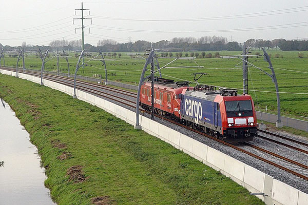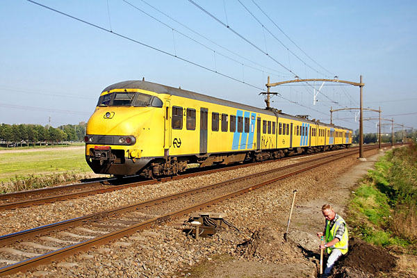 Woerden, 11 oktober 2005. Kolentrein op weg van Rotterdam naar Duitsland, getrokken door locs 6497, 6503 en 6496. De twee rode locs zijn "Duitse Herders". Deze zijn behalve van ATB ook voorzien van Indusi en mogen daarom in Duitsland dienstdoen. De middelste loc is ook in Duitsland toegelaten maar beschikt niet over Indusi. Deze loc mag daarom alleen tussen twee Duitse Herders de grens over. Enkele andere locs van de serie 6400-6500 hebben de bijnaam "Vlaamse Reuzen", omdat ze in België mogen rijden. Let op de stevig uitgevoerde bovenleidingconstructie. Op veel plaatsen waar de bovenleiding wordt vernieuwd of waar nieuwe sporen worden aangelegd, wordt een voorschot genomen op een mogelijke verhoging van de bovenleidingspanning tot 25000 volt. Bij deze spanning zijn zwaardere isolatoren nodig. |