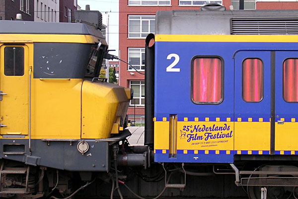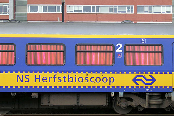 's-Hertogenbosch, 1 oktober 2005. Ter gelegenheid van Nederlands Filmfesitval reed een tot bioscoop verbouwd rijtuig mee in een aantal treinen tussen Amsterdam en Limburg. Zoals hier in trein 939 naar het zuiden. Foto's Stefan van de Werken. |