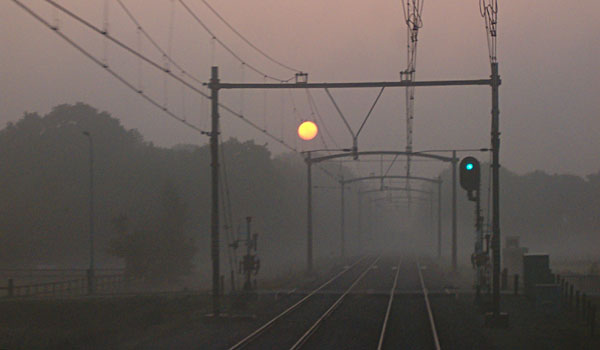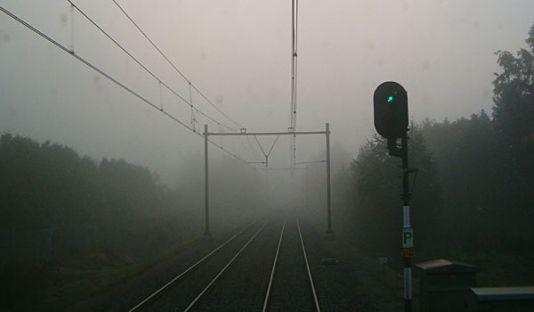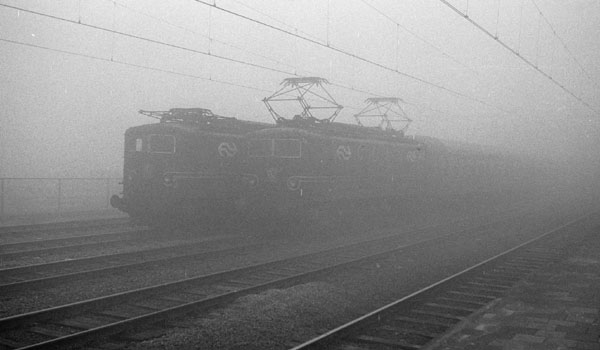 Een machinist maakte deze foto's op 7 oktober 2005 tussen Eindhoven en Deurne. Hij mailde: "In de mist rijden is toch een apart iets. Vooral als het nog donker is. Je ziet dan letterlijk geen hand voor ogen en dus rij je van sein tot sein. Zolang die groen zijn is er niets aan de hand. Maar als je plotseling een gele tegen komt, dan rem ik harder als normaal. Gewoon voor de zekerheid." Foto hieronder: Hilversum, 20 september 1970. Locs 1122 en 1133 's ochtends vroeg in dichte mist. Loc 1122 is bewaard gebleven bij de Werkgroep 1501. Het Spoorwegmuseum bezit ook een 1122, maar dat is in werkelijkheid de 1125. | |