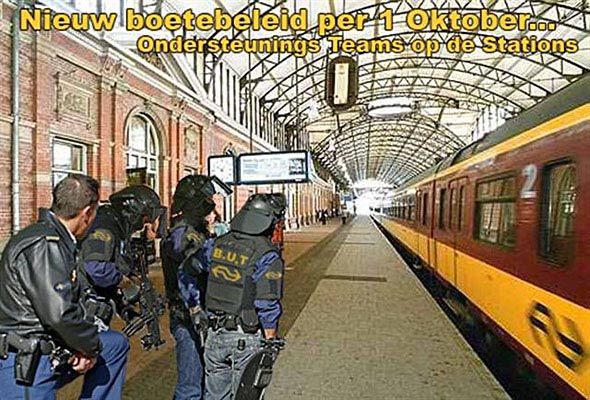 Bij "het spoor" circulerende parafrase op het nieuwe boetebeleid, dat inging op 1 oktober 2005. Geen kaartje kunnen kopen wegens kapotte kaartautomaat? Dat kost u dan 35 euro boete! Dit om ervoor te zorgen dat u dus niet agressief wordt, namelijk. |