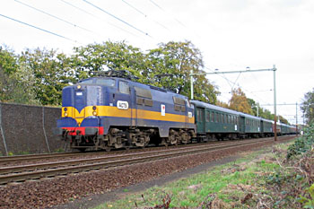 Bilthoven, 13 november 2005. Loc 23 071 is met Sinterklaas op weg van Apeldoorn naar Naarden-Bussum. De trein maakt kop op Utrecht Lunetten. Deze flinke omweg zorgt ervoor dat de Sint op de gewenste wijze in Naarden arriveert. |