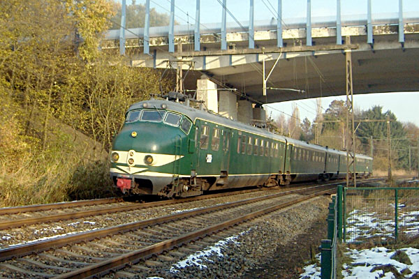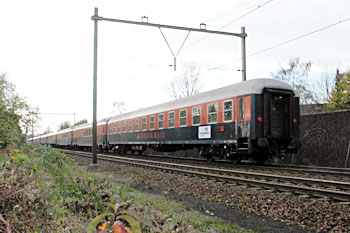 Helmond, 13 november 2005. Een Amerikaans orkest, de New York Symphony, gebruikte de trein om zich te verplaatsen. Op vrijdag 11 november reed de trein van België naar Amsterdam. Op zondag 13 november ging de reis via Hilversum en Arnhem naar Duitsland, en weer terug via Venlo en Eindhoven naar België. De trein bestond uit drie Belgische rijtuigen, hier getrokken door loc 1858. Foto Arnold de Vries. |