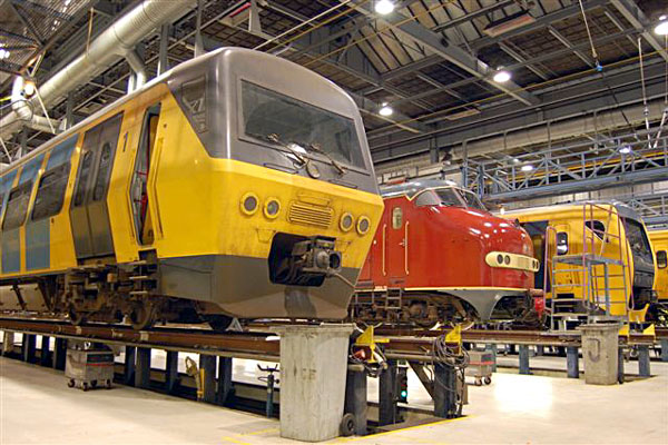 Werkplaats Zwolle, 27 november 2005. SM'90 2105, Plan U 113 en DM'90 3402 vormen samen een bijna historisch beeld. SM'90 gaat buiten dienst en wordt opgevolgd door Plan V. In Zwolle blijven dan alleen nog enkele stellen DM'90 in onderhoud. Foto Patrick Esseling. |