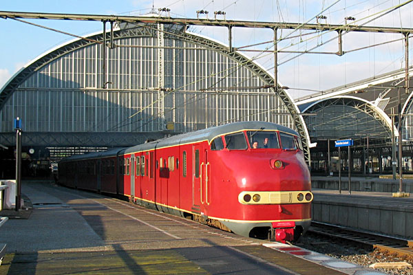 Amsterdam Centraal, 30 november 2005. Ook treinstel 113 was betrokken bij het rijden van afscheidsritten. De machinist zwaait nog even naar fotografe Els Bary. |
