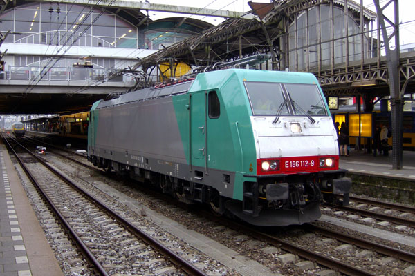 Utrecht, 20 augustus 2007. Traxx-locomotief E186 112. In de verte, op hetzelfde spoor, staat meettrein UST-96. In Rotterdam zag ik loc E186 114. Deze week worden er instructieritten gereden tussen Amsterdam (Wgm) en Rotterdam. Locs van dit type zullen binnenkort op de HSL dienst gaan doen. |