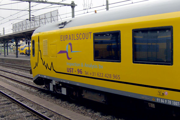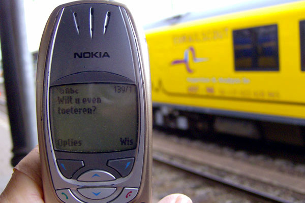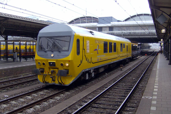 Utrecht, 20 augustus 2007. Meettrein UST-96 van Eurailscout met zijn onafscheidelijke aanhangwagentje. Op de zijkant van deze trein staat heel groot een 06-nummer. En toen werd het belletrekkertje van heel lang geleden weer in mij wakker. Het personeel van deze trein had humor en vroeg per sms waar ze zouden moeten toeteren. Maar toen was de UST-96 al vertrokken en zat ik inmiddels in de trein naar Rotterdam. Ik heb ze een bericht gestuurd dat ze 's avonds maar even op mijn site moeten kijken. Dat zouden ze doen. Ik groet u hartelijk! En als u een keer door Bunnik komt, graag even toeteren bij km 42,5. |