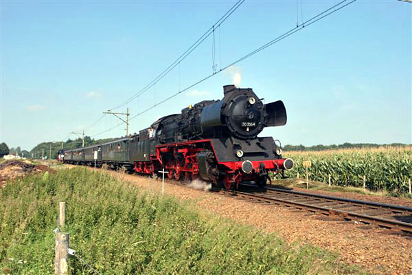 Nossen, 24 augustus 2007. Locs 35 1019 en 1097 tijdens een rit in het kader van Heizhausfest Chemnitz. Dit zijn locs van de naoorlogse Baureihe 23.10 die in de DDR zijn gebouwd. In 1970 werden de locs vernummerd in Baureihe 35, omdat serienummers die met een 2 begonnen vanaf toen werden gebruikt voor e-locs. Foto Bertus Kers. |
