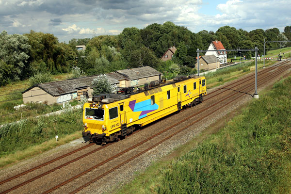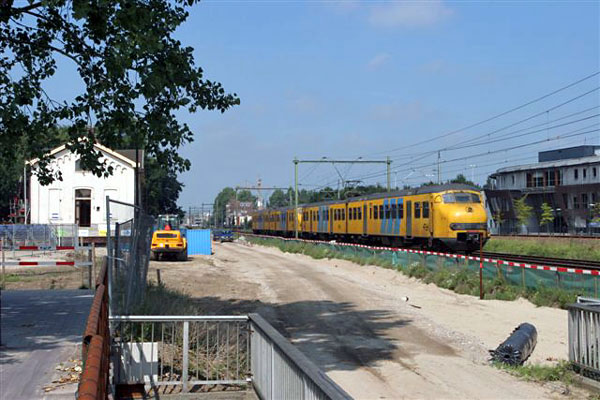 Hilversum, 5 augustus 2007, aan het begin van de vrije baan naar Baarn. Tussen de rails zit een permanente magneet. Deze is bedoeld als ijkpunt voor de ultrasoontrein. Tegenwoordig is dat de UST 02 "Karla Peijs". Foto Rienk Nauta. |